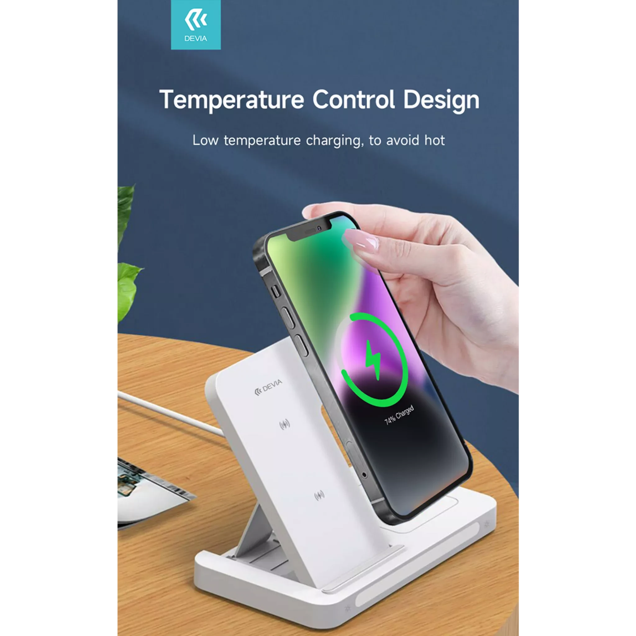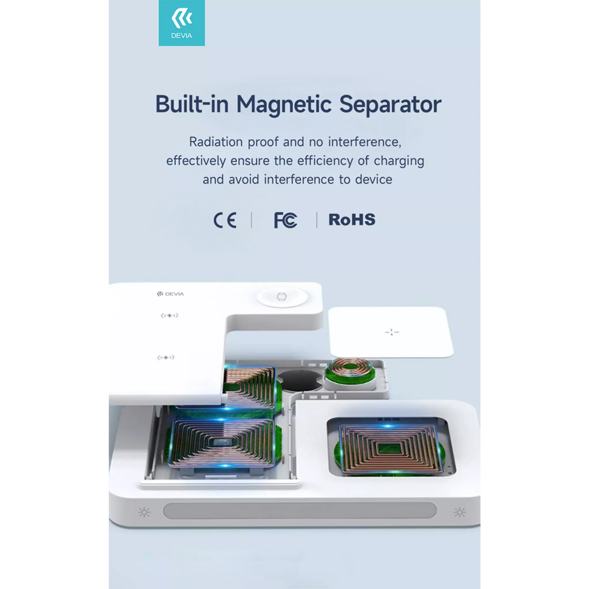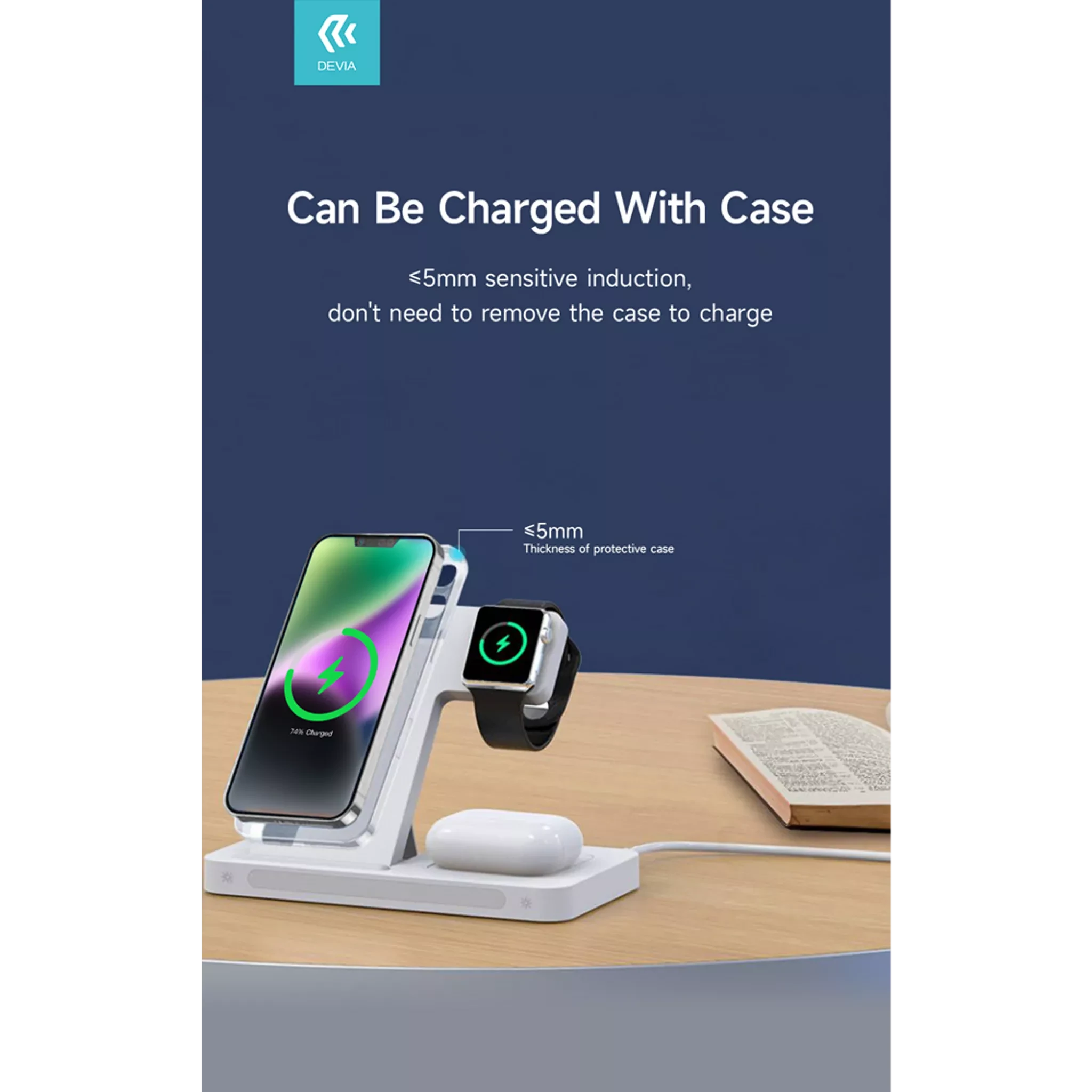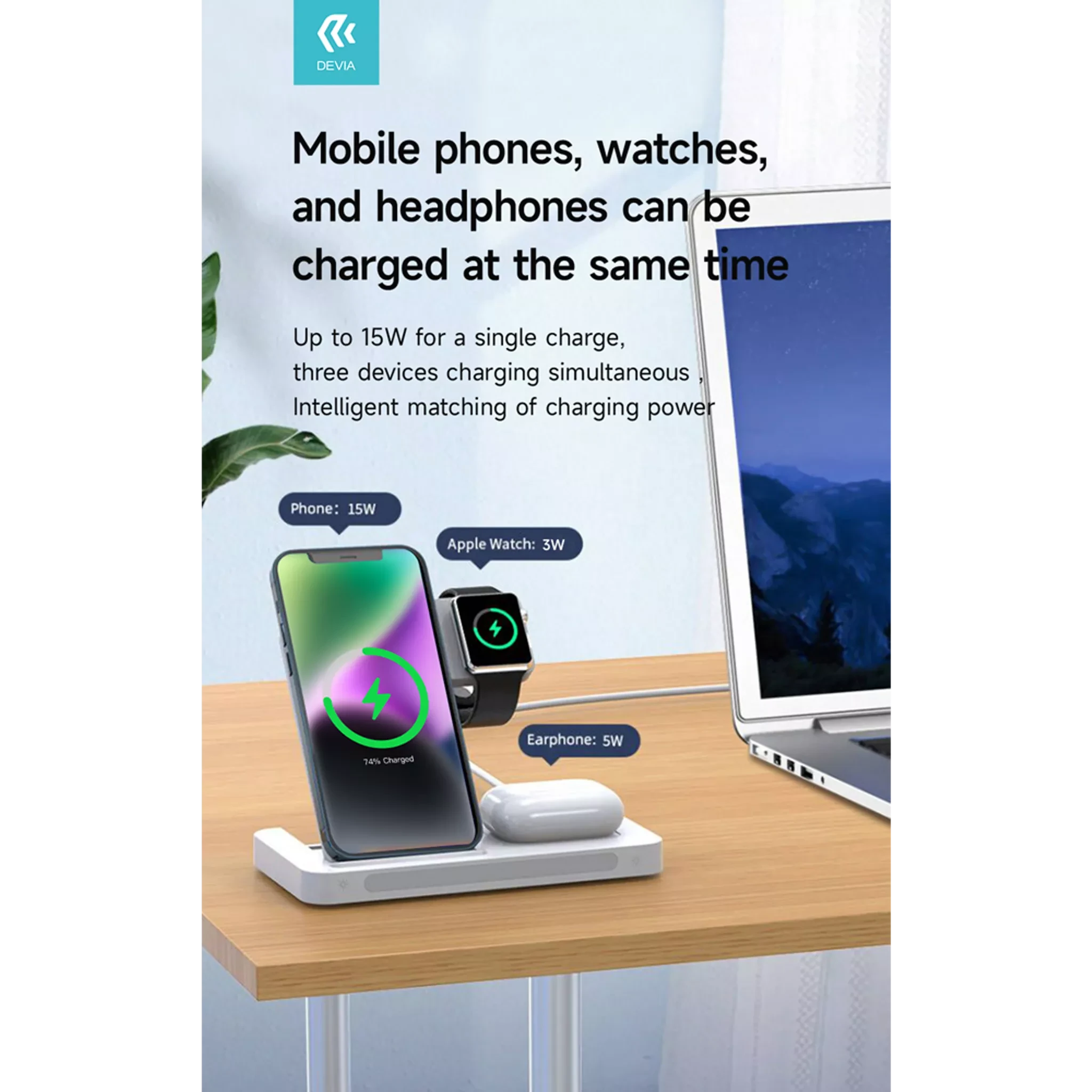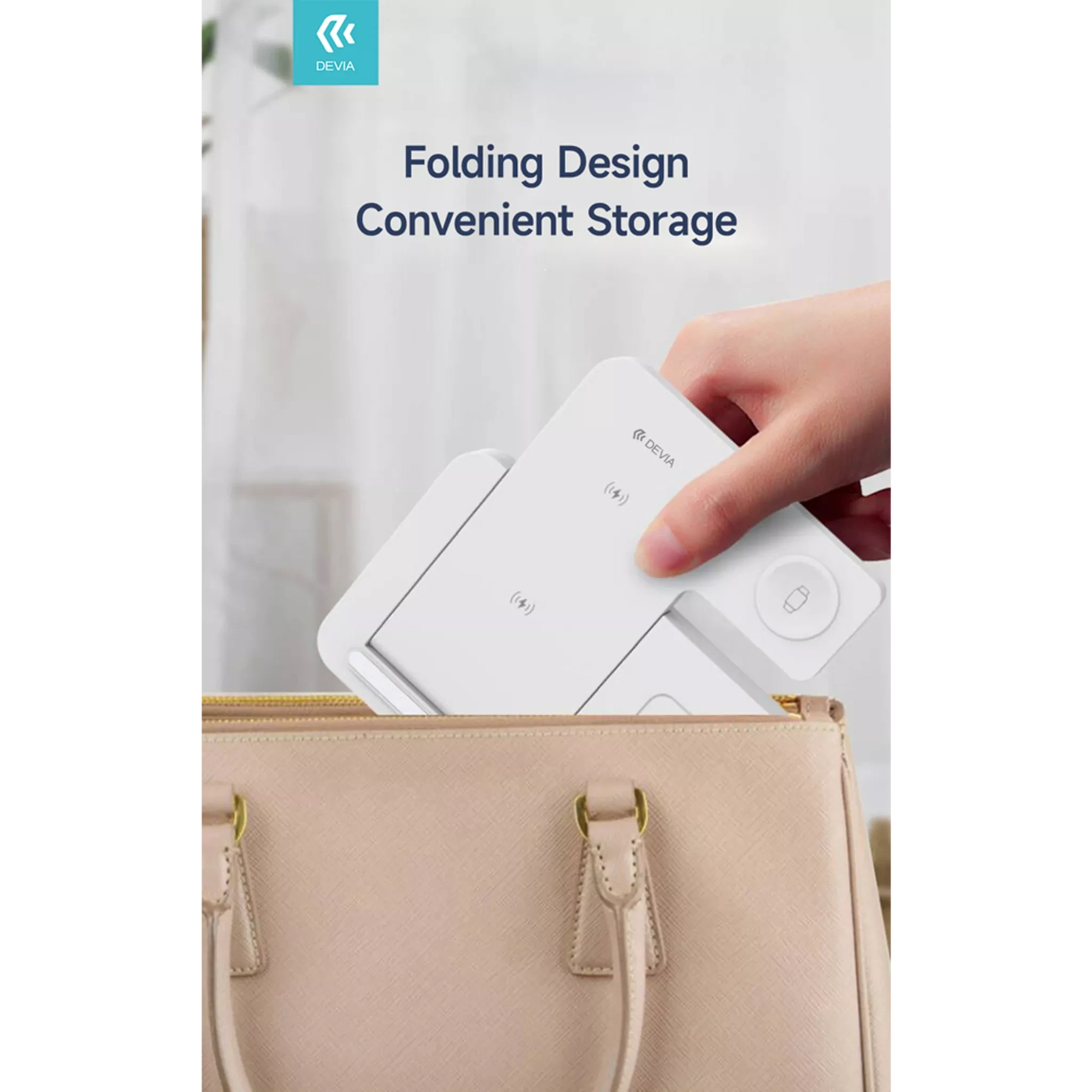 Devia - 15W Foldable Travel Triple Wireless Magnetic Charging Pad for Apple iPhone, Airpods & Watch & Night Lamp - White