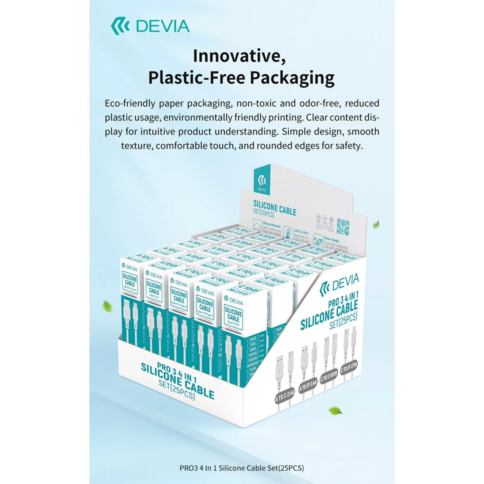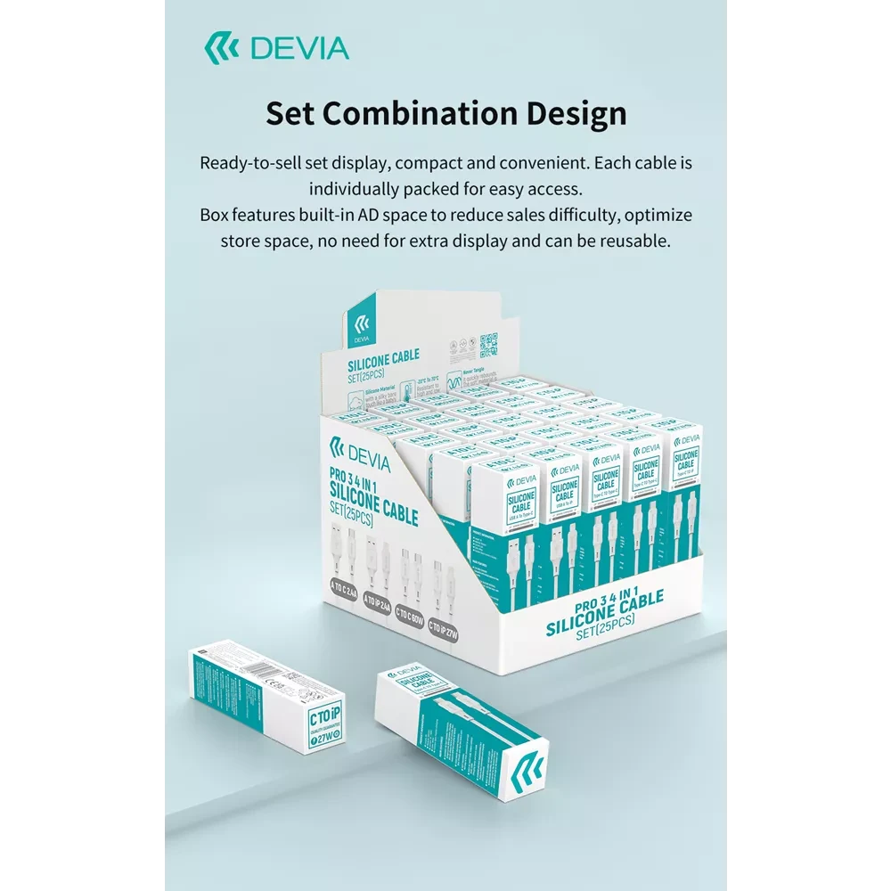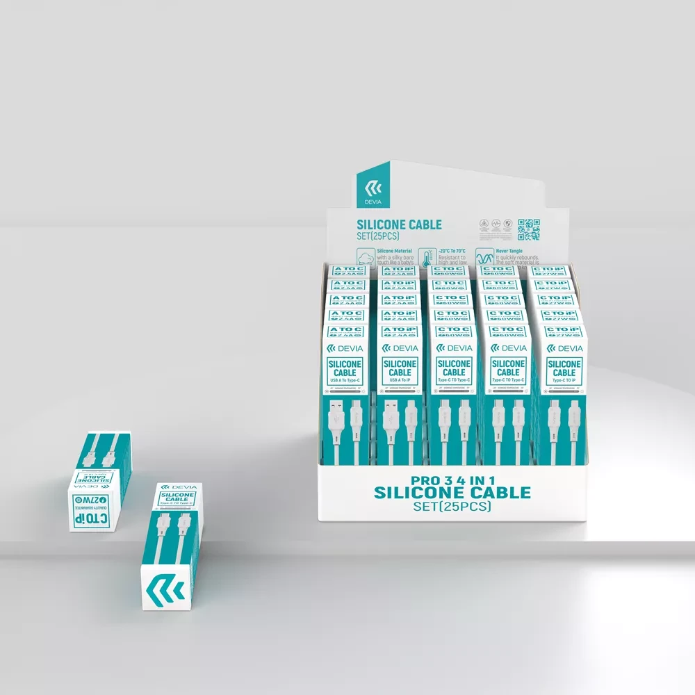Devia presents a complete 25-piece Silicone Cables Set designed for everyday charging and data transfer needs. The set contains a balanced mix of connector types so you can power and sync a wide range of devices from one neat kit. This retail-ready pack is presented in a compact box sized 180 × 180 × 130 mm and is branded for easy shelf display and storage.