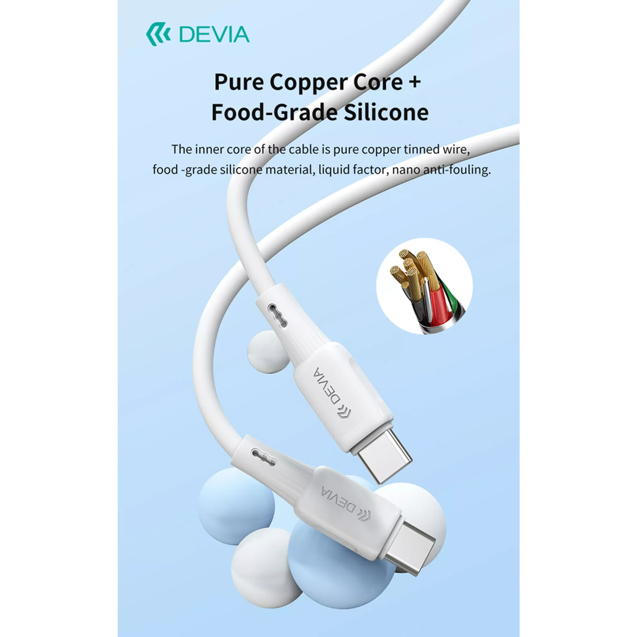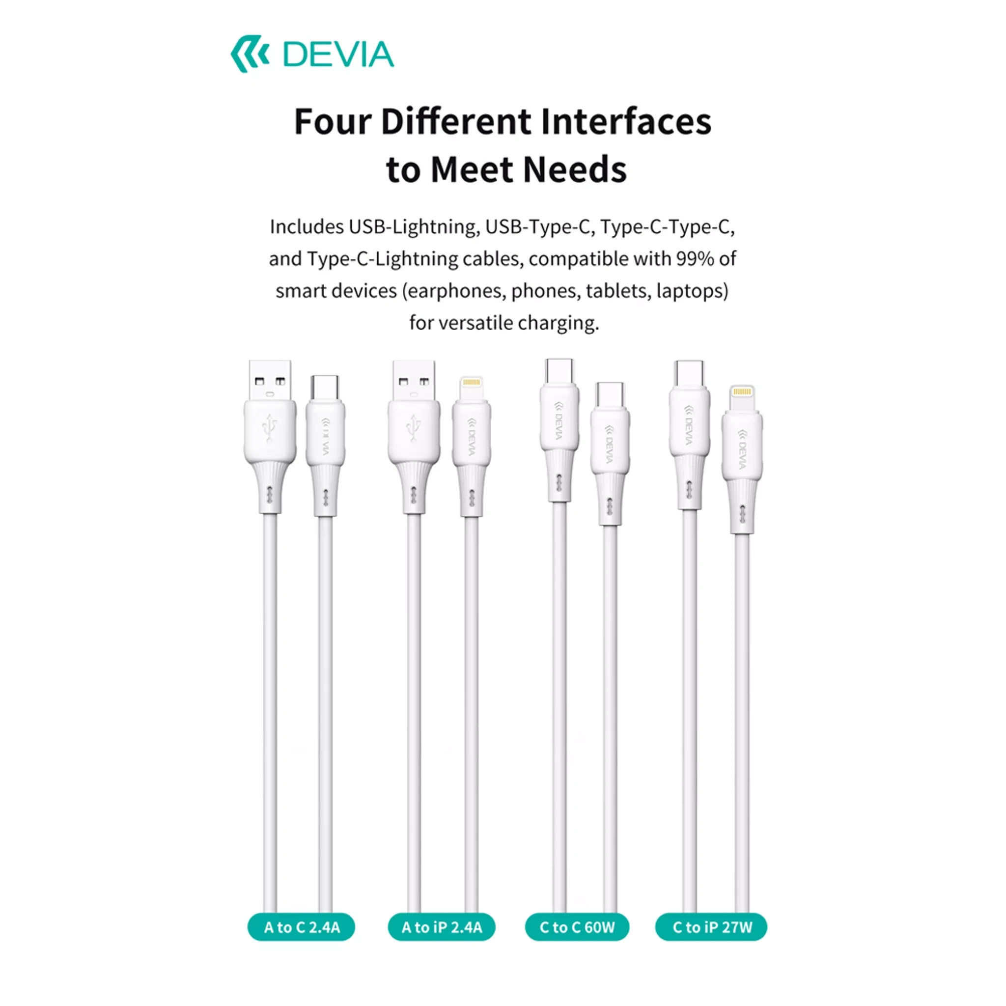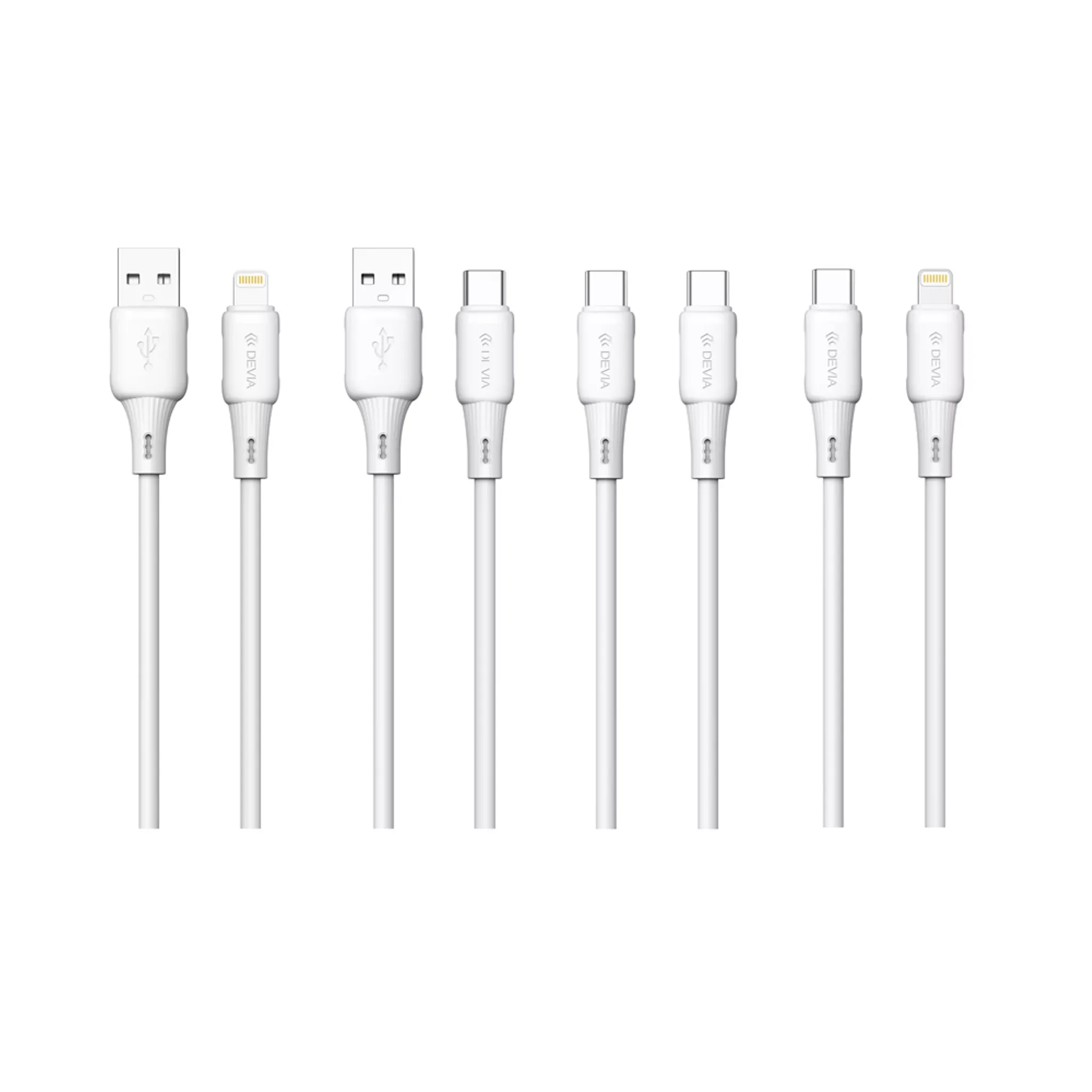 Devia presents a complete 25-piece Silicone Cables Set designed for everyday charging and data transfer needs. The set contains a balanced mix of connector types so you can power and sync a wide range of devices from one neat kit. This retail-ready pack is presented in a compact box sized 180 × 180 × 130 mm and is branded for easy shelf display and storage.