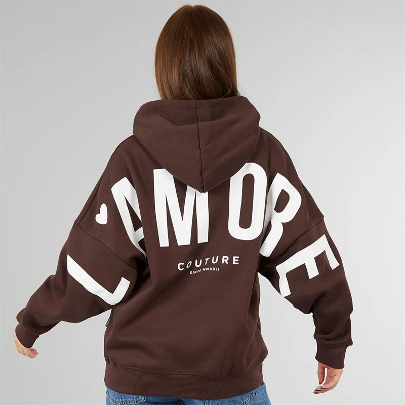 The loose fit offers easy movement and laid-back styling, while the rubberised L’amore Couture logo adds a bold, contemporary finish. A lined hood, ribbed cuffs and hem, and clean straight hem complete the look, making it perfect for casual days, lounging, or off-duty outfits.